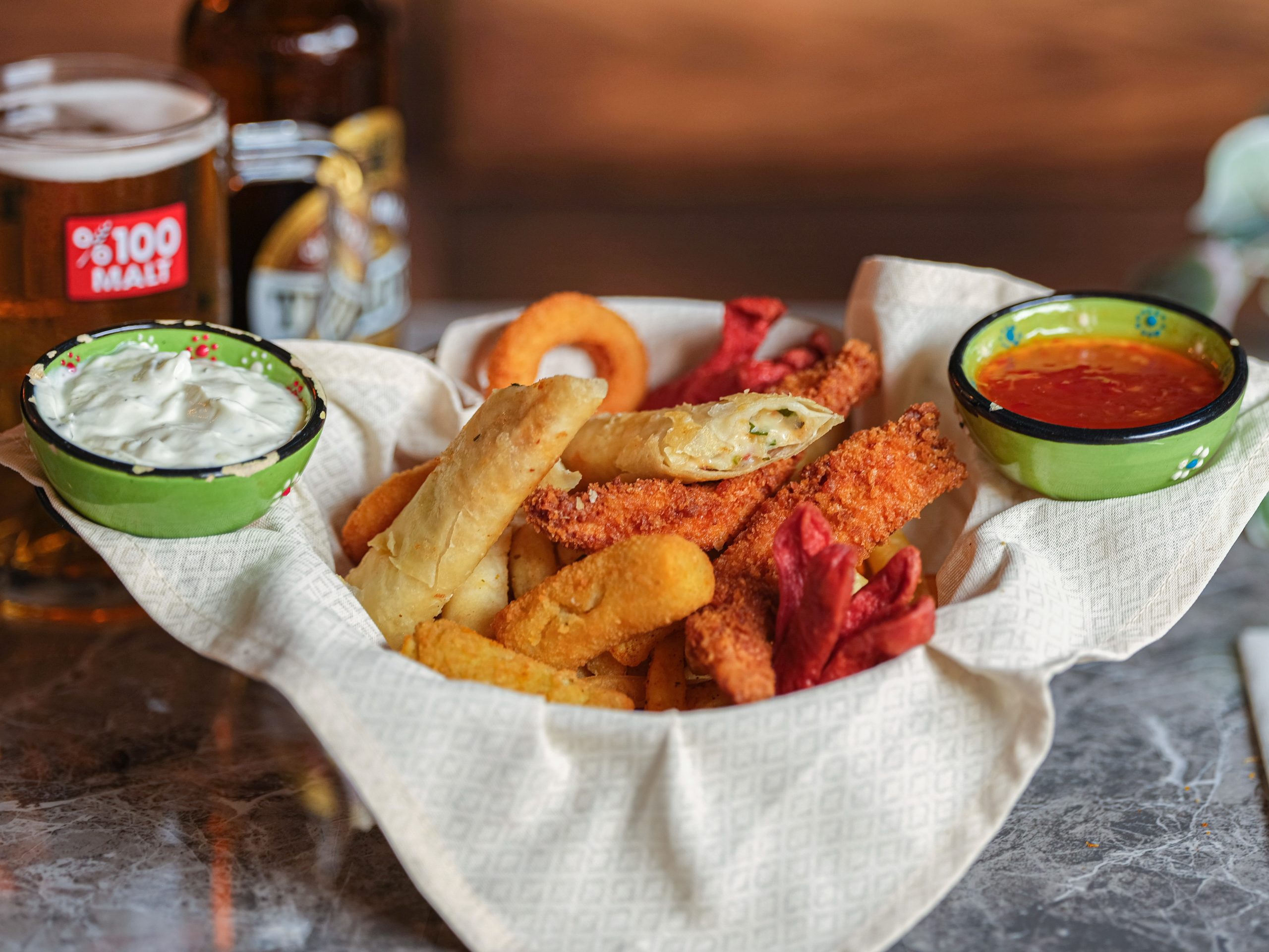 Elma dilim ve parmak patates,soğan halkası,mozerella stick,fileto tavuk,sigara böreği