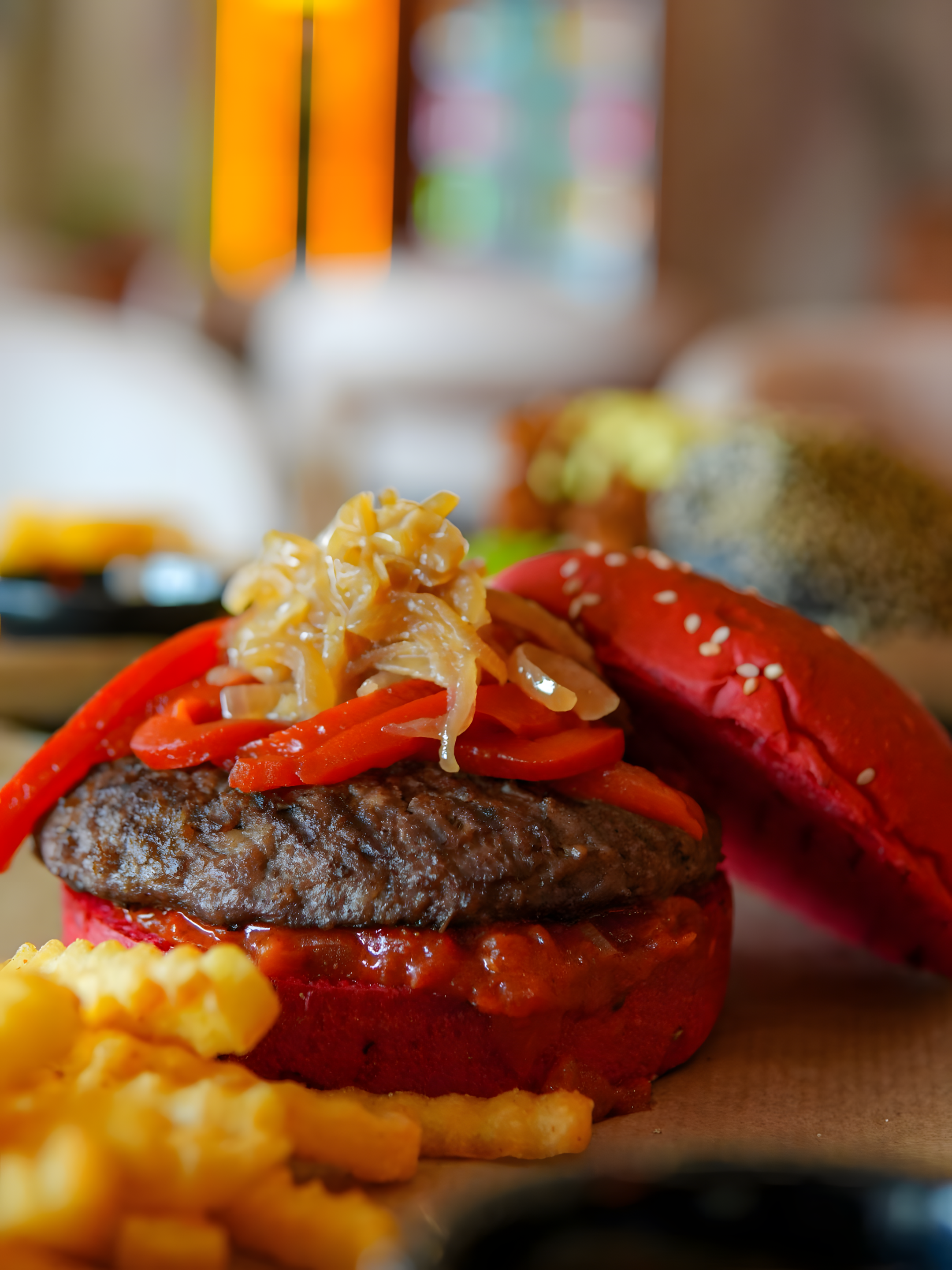 Köfte, acılı sos, soğan sote, köz biber, patates tava ile