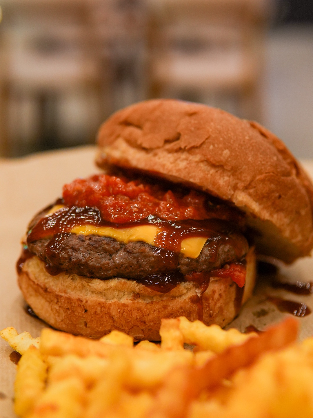 Köfte, Acılı Domates Sos, Barbeqü Sos, Cheddar, Patates Tava ile